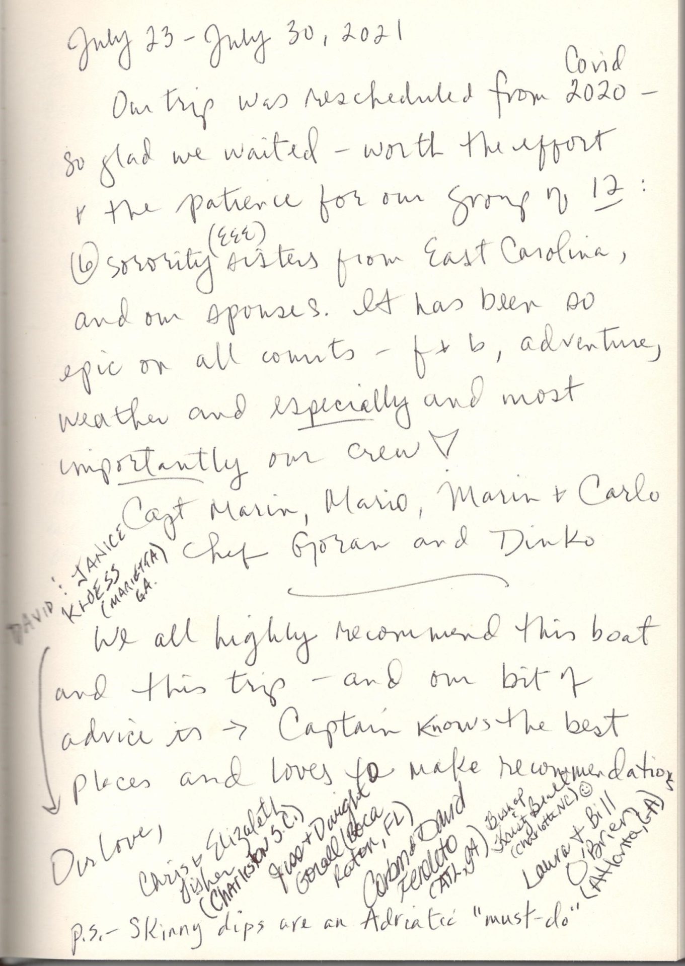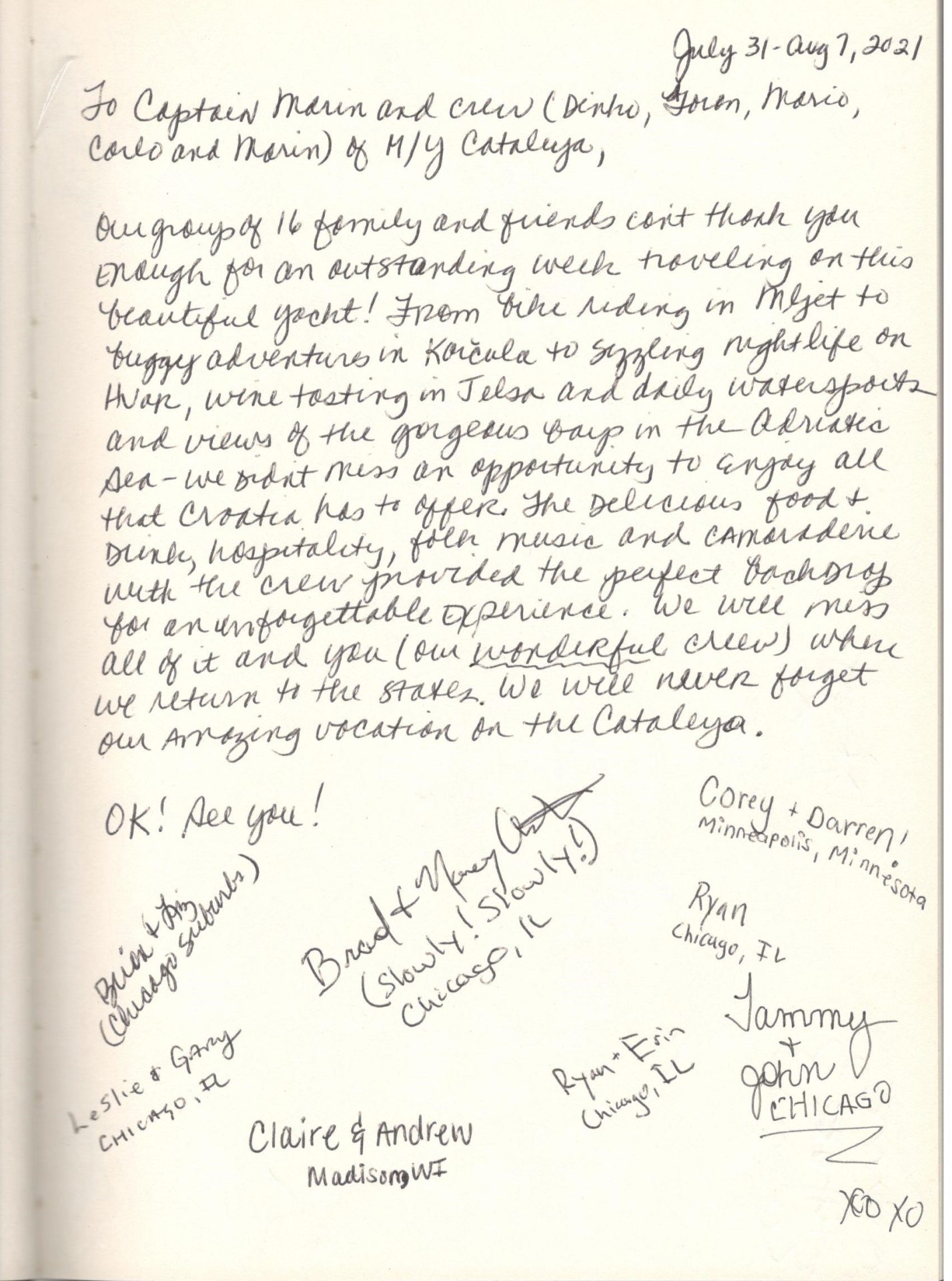 To our wonderful captain & crew of the Cataleya – you all made our week aboard so very special. We didn’t even know about Croatia before, and now we will never forget your beautiful country. Your helpfulness, kindness, humor, all made our week a wonderful experience.