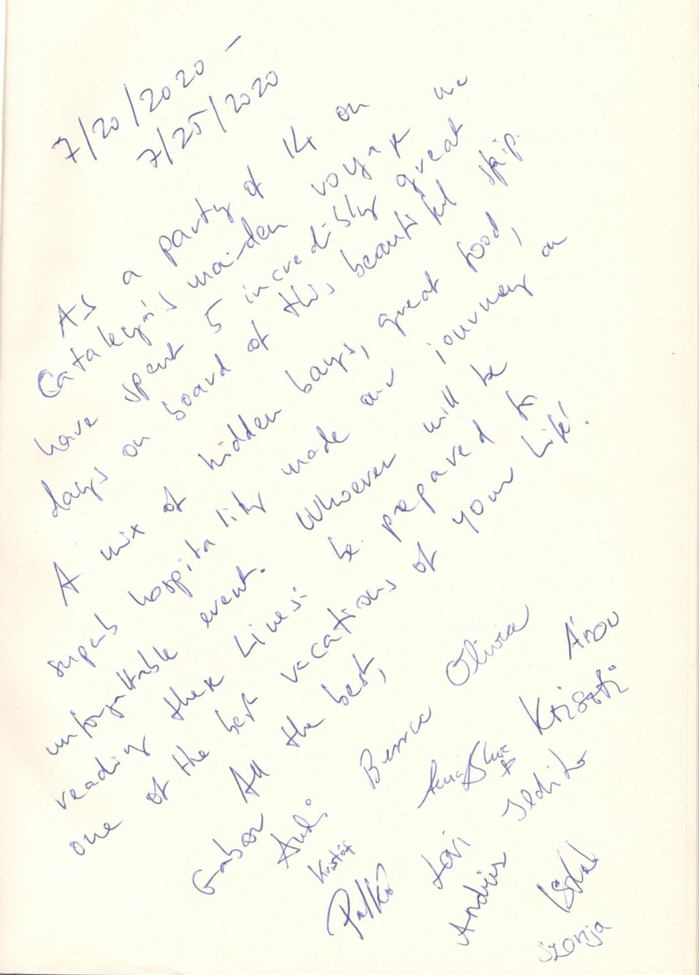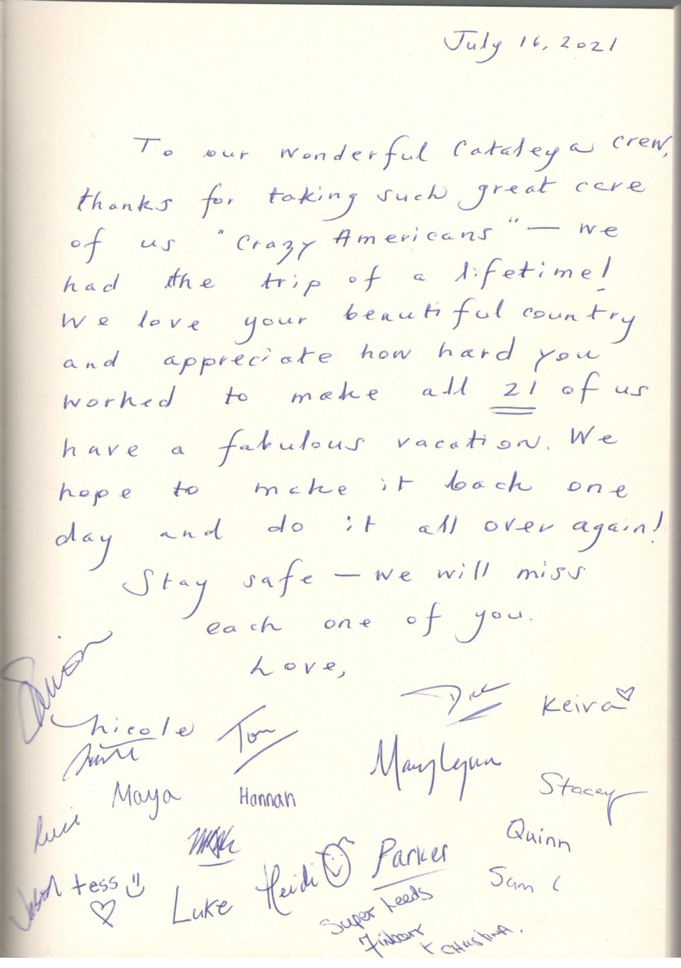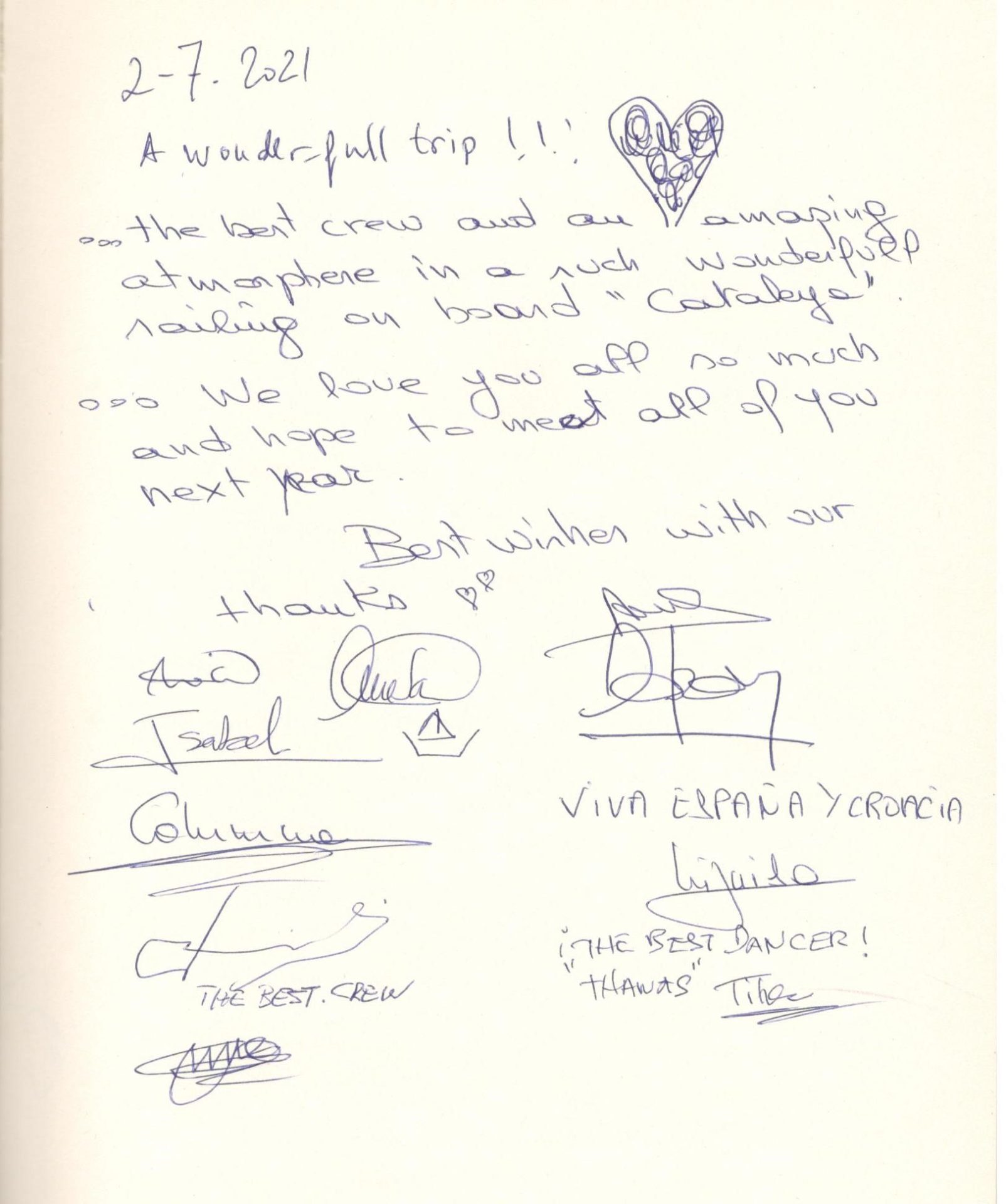 To the Best of the Best, the captain and amazing crew of the CATALEYA! This was the Best trip Ever! From B family!